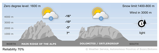The high-pressure system will weaken and during the night a small-scale low-pressure system will move across South Tyrol.