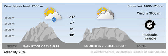 The afternoon will be partly cloudy. There will be longer sunny spells towards the west, with thicker clouds in the Dolomites. In the upper Puster Valley, there will be a brisk easterly wind at times.